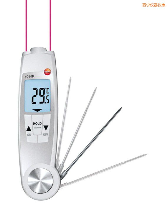 紅外及接觸式測溫二合一testo 104-IR配備精確的2點瞄準激光,光學分辨率10:1,溫度計 被測物,測量范圍清晰可見,可隨時進行快速并精確的表面溫度測量。二合一溫度測量儀特別適用于食品進貨檢測以及快速檢測單個或整箱食品的表面溫度。 刺入式溫度探頭適用于測量如肉類和香腸等食品的核心中心溫度。通常,在紅外表面溫度測量不足以判定食品安全的情況下使用。刺入式探頭在不使用時可通過折疊方式收入儀器中,探針式溫度計,以防折斷損壞。