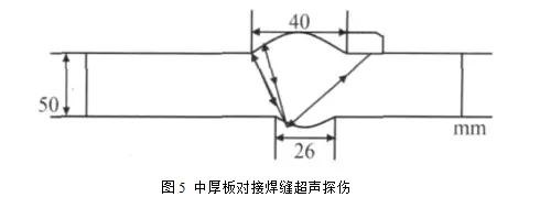 中厚板對接焊縫超聲波探傷時探頭下擴散聲束在焊縫表面的反射回波很容易被誤判為缺陷。如在厚板焊縫中(T=50mm左右)常發(fā)現(xiàn)距背面4~10mm深度范圍內的熔合線附近有不同長度連續(xù)的超標反射波(圖5).