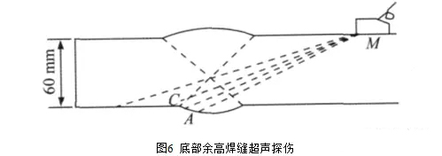 同樣道理在圖6所示焊縫探傷時若A點處焊縫表面不利于軸線聲束反射而只與下擴散角范圍內某部分聲束相垂直時則得到較高的回波其儀器提供的深度和水平距離卻錯誤地被指示為C點。
